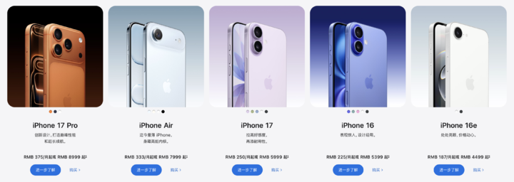 这里指的不是 iPhone 17 Pro 和 iPhone 17 Pro Max 之间的并行,而是「实用主义的 Pro 系列」+「水桶化的数字系列」+「筹算导向的 Air 系列」之间的并行。