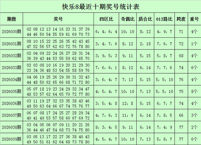 福彩快意8第2026039期开奖讲求:03 05 13 17 22 27 36 38 40 43 49 50 51 61 62 64 68 73 78 80,其中奖号四区比为4:5:4:7,奇偶比为10:10,质合比为7:13,跨度为77,012路比为5:8:7,开出6个重号:03、05、36、68、73、80。
