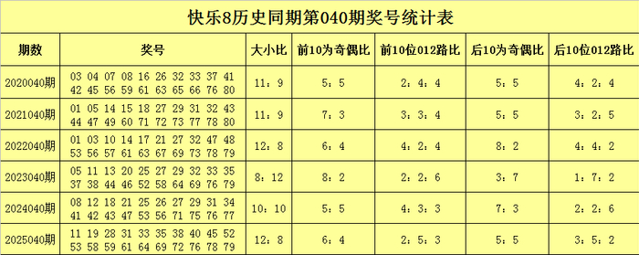 从上表不错看出,在第040期历史同时开奖中,前10为号码奇偶比为37:23,奇数号码开出频次较高,旧年同时前10位以奇数号码为主,开出了6个奇号,本年同时前10位细心偶数号码相宜回补,关爱奇偶比5:5,看好号码01、02、05、14、16、17、24、25、31、36。